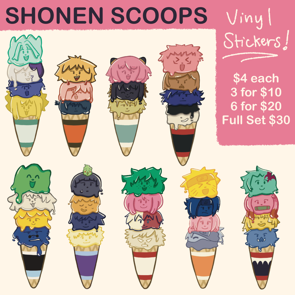 Shonen scoops are your favorite shonen heroes as wonderful ice cream treats! Stickers are weatherproof and vary from 3" - 5"
